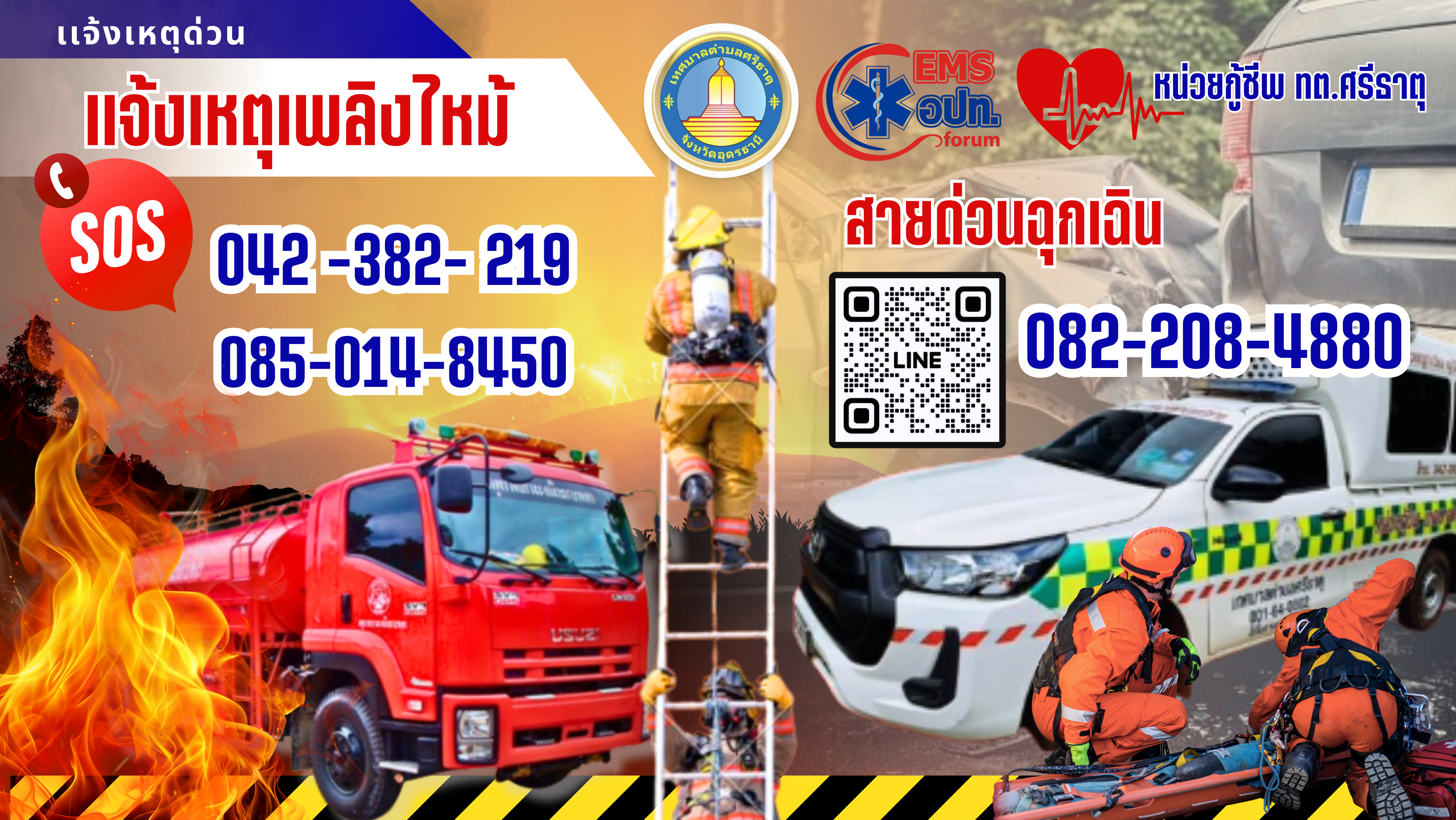 ประชาสัมพันธ์เบอร์ด่วนแจ้งเหตุเพลิงไหม้และการขอความช่วยเหลือฉุกเฉินจากหน่วยกู้ชีพของเทศบาลตำบลศรีธาตุ