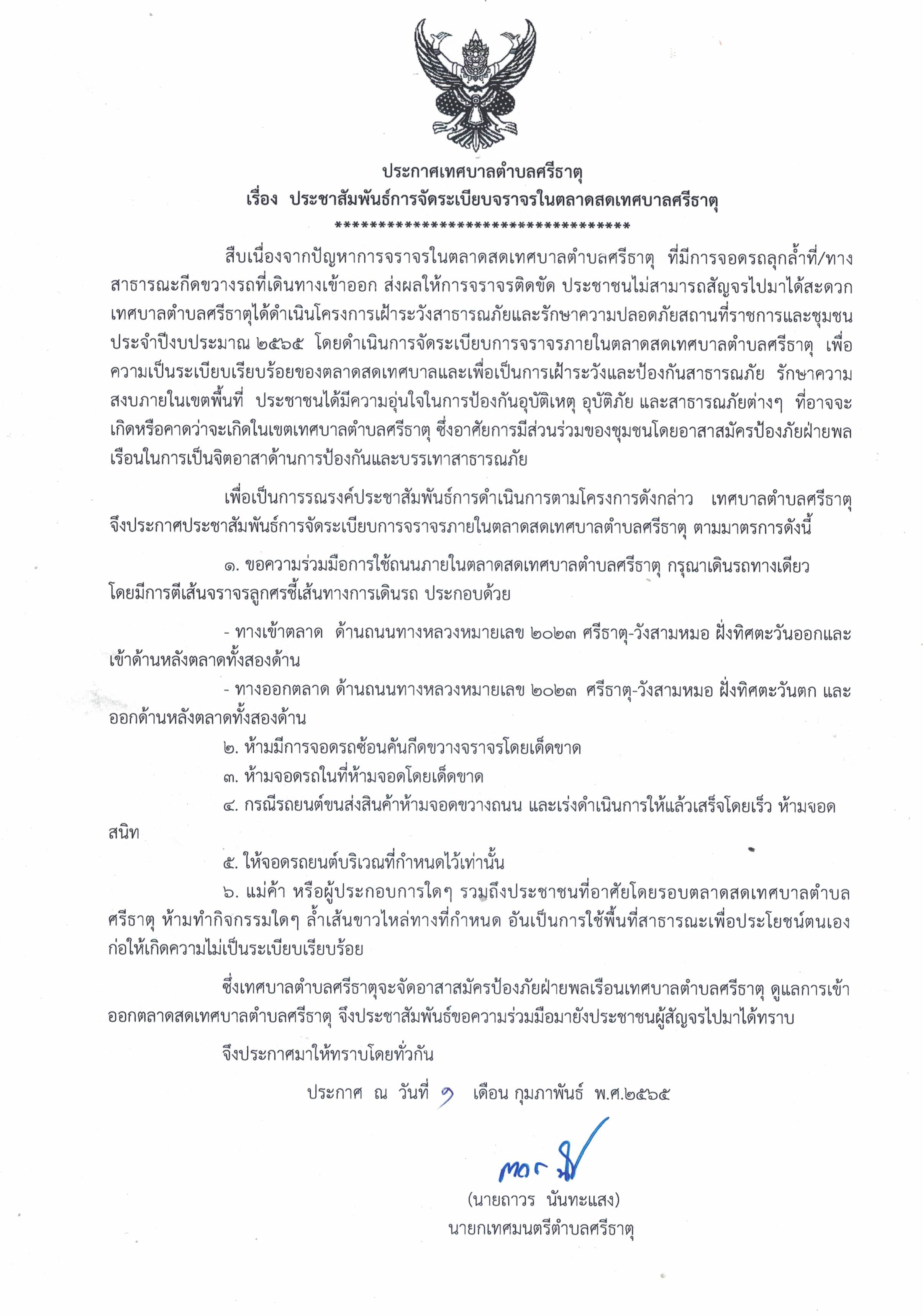 ประชาสัมพันธ์การจัดระเบียบจราจรในตลาดสดเทศบาลตำบลศรีธาตุ