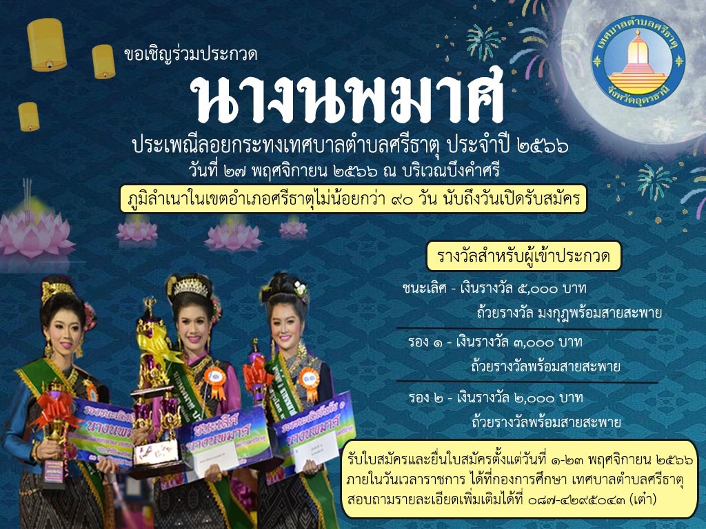 รายละเอียด : เทศบาลตำบลศรีธาตุ ขอเชิญสาวงามผู้สนใจเข้าร่วมประกวดนางนพมาศ งานสืบสานประเพณีลอยกระทง ประจำปี 2566 โดยสามารถสมัครได้ตั้งแต่วันที่ 7 พฤศจิกายน 2566 ถึง วันที่ 23 พฤศจิกายน 2566 ณ กองการการศึกษา เทศบาลตำบลศรีธาตุ (ชั้น 2 อาคารหลังใหม่) ตั้งแต่เวลา 08.30 -16.30 น.