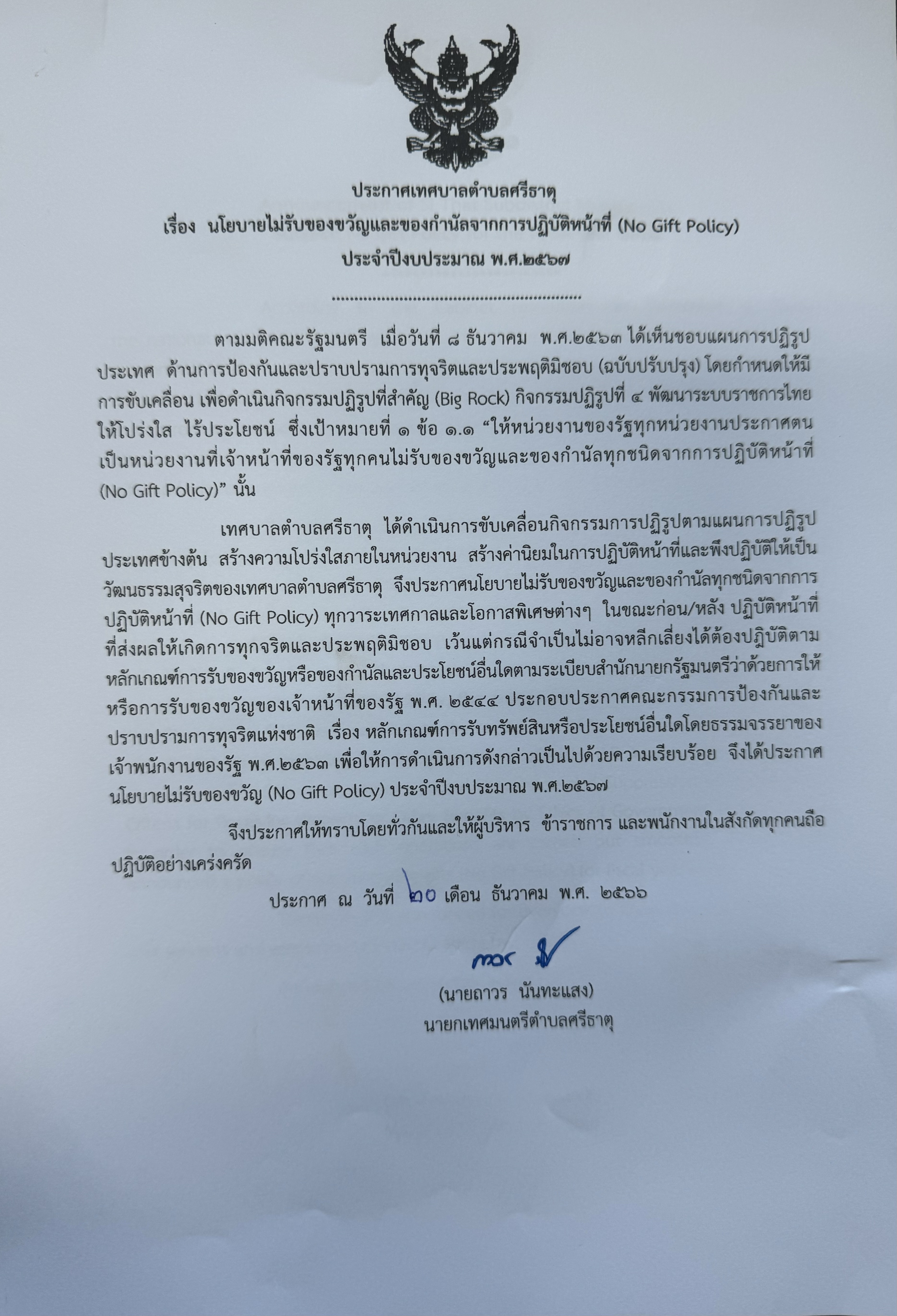 ประกาศเทศบาลตำบลศรีธาตุ เรื่อง "นโยบายไม่รับของขวัญและของกำนัลจากการปฏิบัติหน้าที่ (No Gift Policy)" ประจำปีงบประมาณ พ.ศ.2567