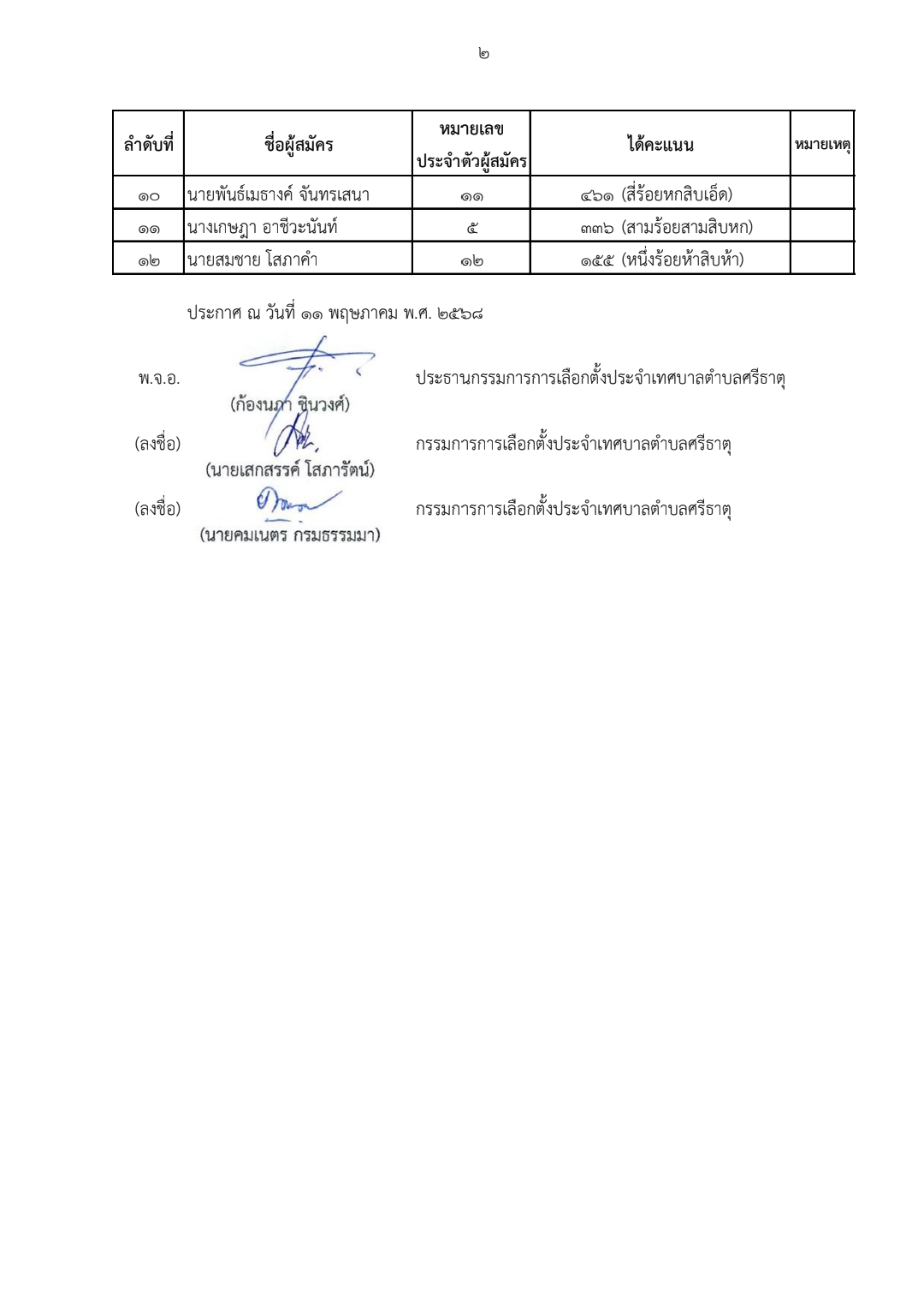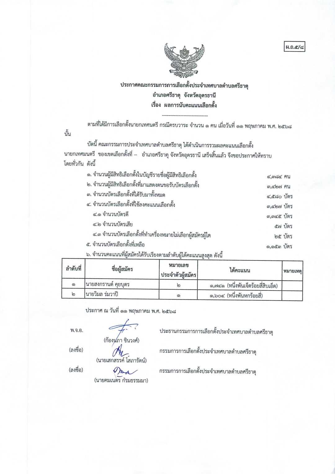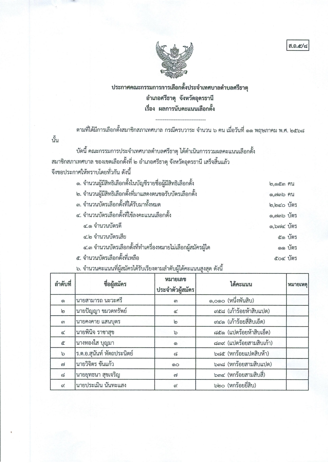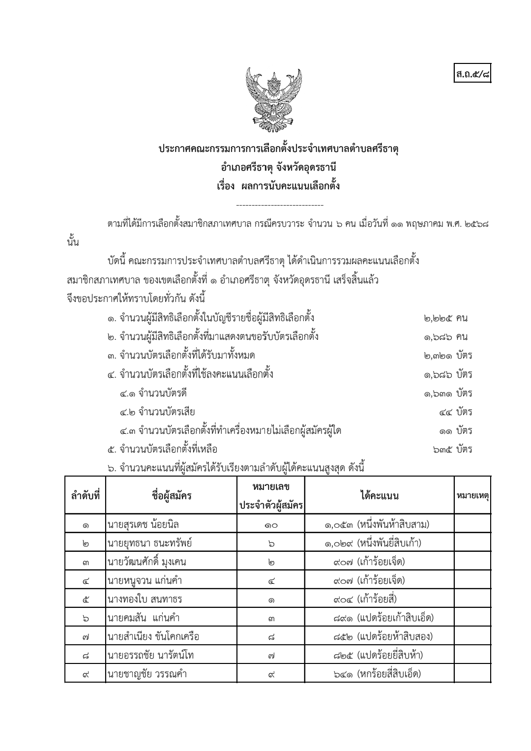 การประกาศผลการนับคะแนนเลือกตั้ง (ส.ถ. 5/8, ผ.ถ. 5/8) ตามข้อ 177 ของระเบียบ กกต. ว่าด้วยการเลือกตั้งสมาชิกสภาท้องถิ่น ฯ และรายงาน ผู้อำนวยการ สำนักงานคณะกรรมการการเลือกตั้งประจำจังหวัดอุดรธานี ดำเนินการส่งประกาศให้ กกต. รับรองผลการเลือกตั้ง ฯ ต่อไป