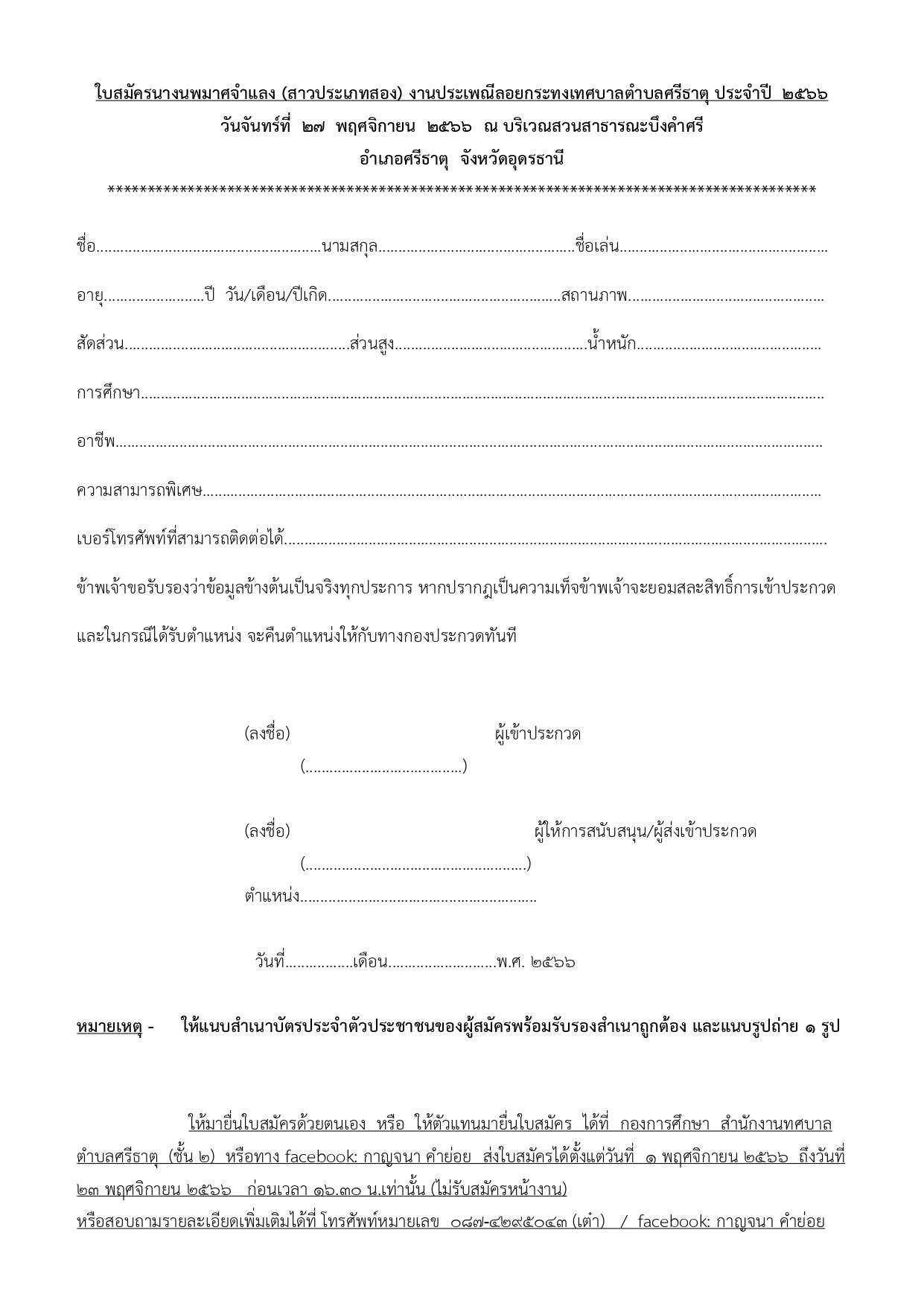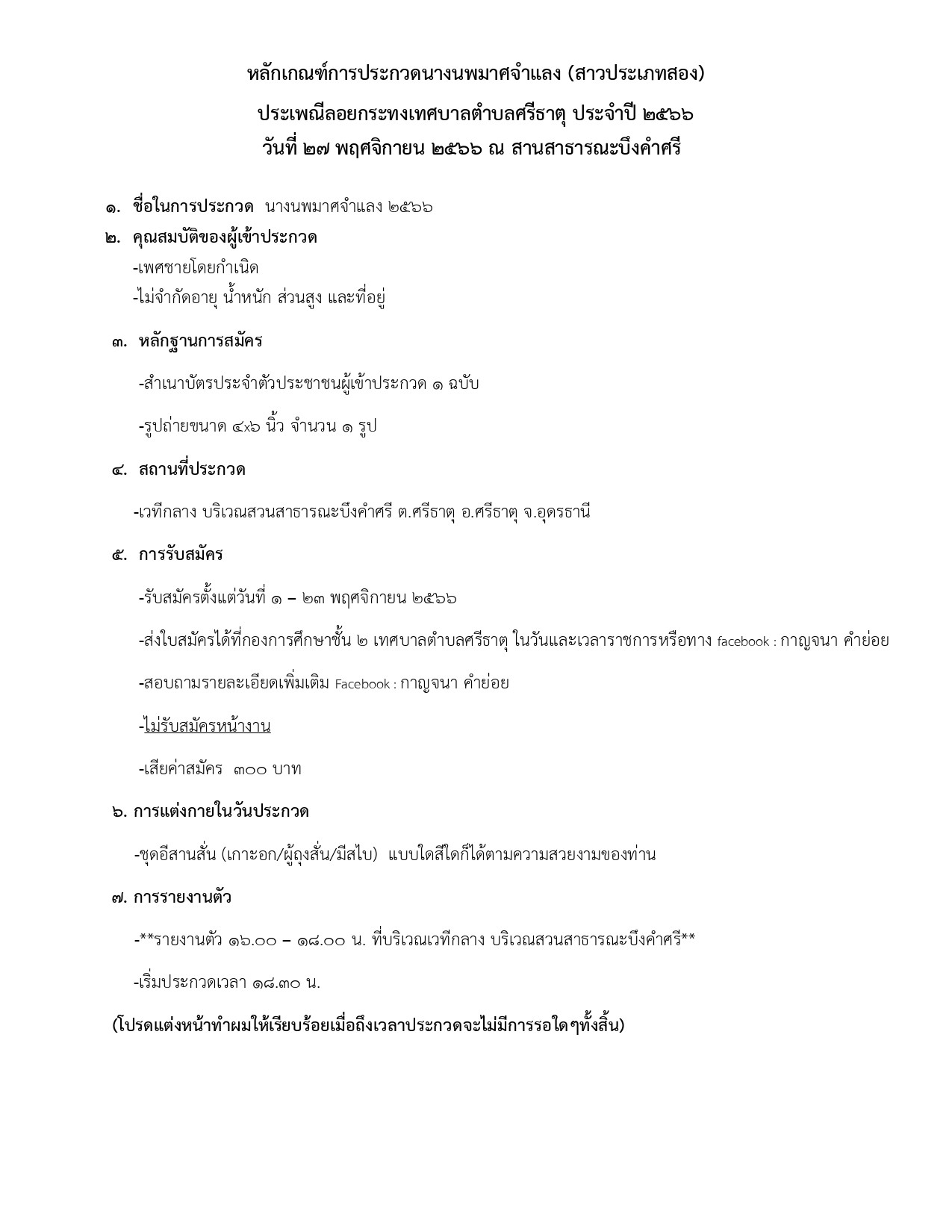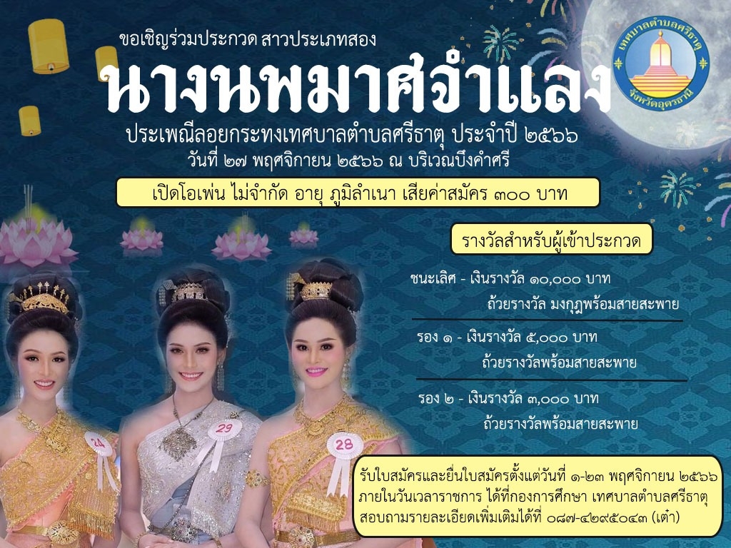 เทศบาลตำบลศรีธาตุ ขอเชิญสาวงาม(สาวประเภทสอง)ผู้สนใจเข้าร่วมประกวดนางนพมาศจำแลง งานสืบสานประเพณีลอยกระทง ประจำปี 2566 โดยสามารถสมัครได้ตั้งแต่วันที่ 7 พฤศจิกายน 2566 ถึงวันที่ 23 พฤศจิกายน 2566 ณ กองการการศึกษา เทศบาลตำบลศรีธาตุ (ชั้น 2 อาคารหลังใหม่) ตั้งแต่เวลา 08.30 -16.30 น.